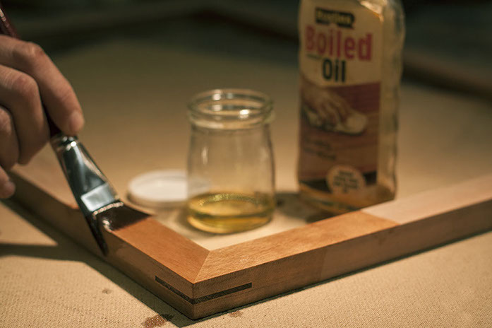 Boiled Linseed oil is applied to the bare frame, rested, then rubbed down with a clean cloth.